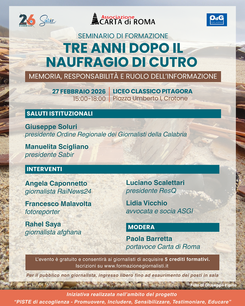 Venerdì 27 febbraio alle ore 15:00 nell’Aula Magna del Liceo Classico Pitagora di Crotone si svolgerà il corso di formazione“Tre anni dopo il naufragio di Cutro: memoria, responsabilità e ruolo dell’informazione”,organizzato dall’Associazione Carta di Roma in collaborazione con Sabir e l’Ordine Regionale dei Giornalisti della Calabria. Dopo i saluti diGiuseppe Soluri, Presidente Ordine Regionale dei Giornalisti della Calabria, e Manuelita Scigliano, Presidente Sabir, interverranno: Angela Caponnetto (Giornalista RaiNews24), Francesco Malavolta (Fotoreporter), Rahel Saya (giornalista afghana), Luciano Scalettari (Presidente ResQ), Lidia Vicchio (Avvocata e socia ASGI). Modera Paola Barretta (giornalista Carta di Roma).L’evento è gratuito e consentirà ai giornalisti di acquisire 5 crediti formativi. Iscrizioni per i giornalisti su www.formazionegiornalisti.it